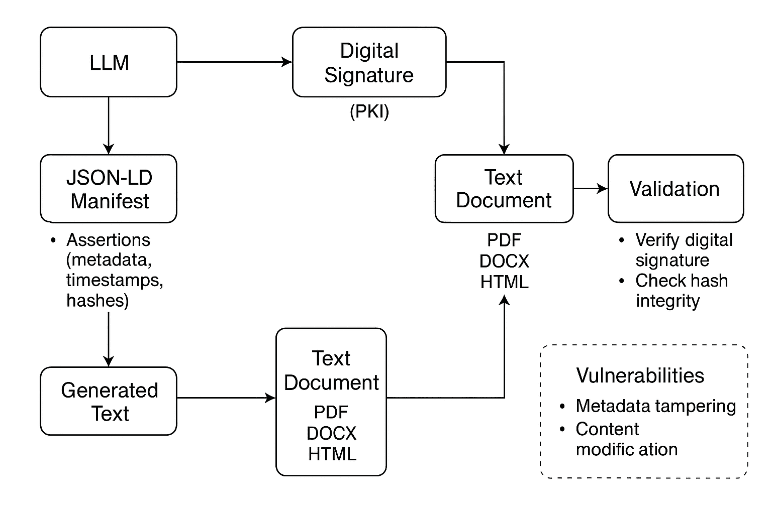 Avec la démocratisation rapide des grands modèles de langage (LLM), identifier précisément la provenance des textes générés par l'intelligence artificielle devient crucial, en particulier pour combattre efficacement la triche académique et le plagiat. La C2PA, initialement conçue pour authentifier les contenus visuels comme les images ou les vidéos, commence désormais à être explorée pour les documents textuels. Toutefois, cette application au texte reste encore à un stade embryonnaire, nécessitant des recherches approfondies et une adoption plus large pour véritablement répondre aux défis actuels.